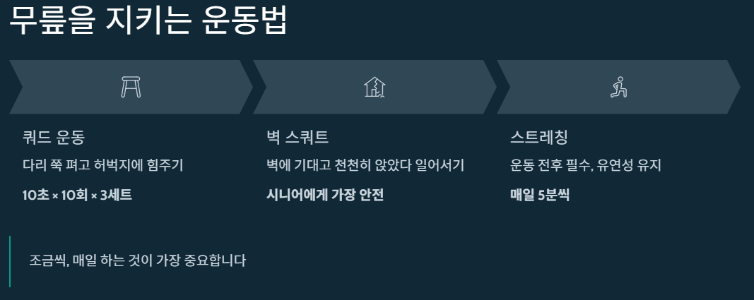 무릎 통증은 관리만 잘해도 훨씬 편해질 수 있습니다.